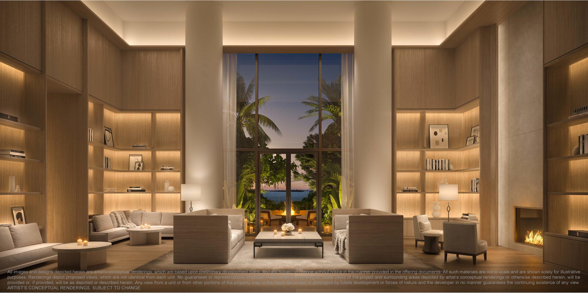 - Library and social lounges leading to bayfront garden terraces with private fireside lounges